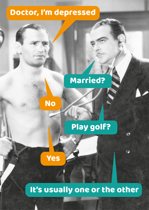 Greeting card with a funny cartoon showing a man seeing his local doctor, with a complaint of depression. The GP quickly gets to the root cause!