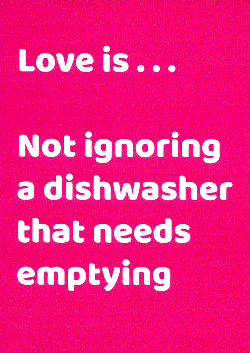 Greeting card with a funny statement about what love - perhaps it's when you don't pretend to not notice that the dishwasher needs emptying?!