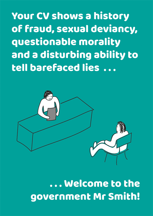 Your CV shows a history of fraud, sexual deviancy, questionable morality and a disturbing ability to tell barefaced lies . . . Welcome to the government Mr Smith!